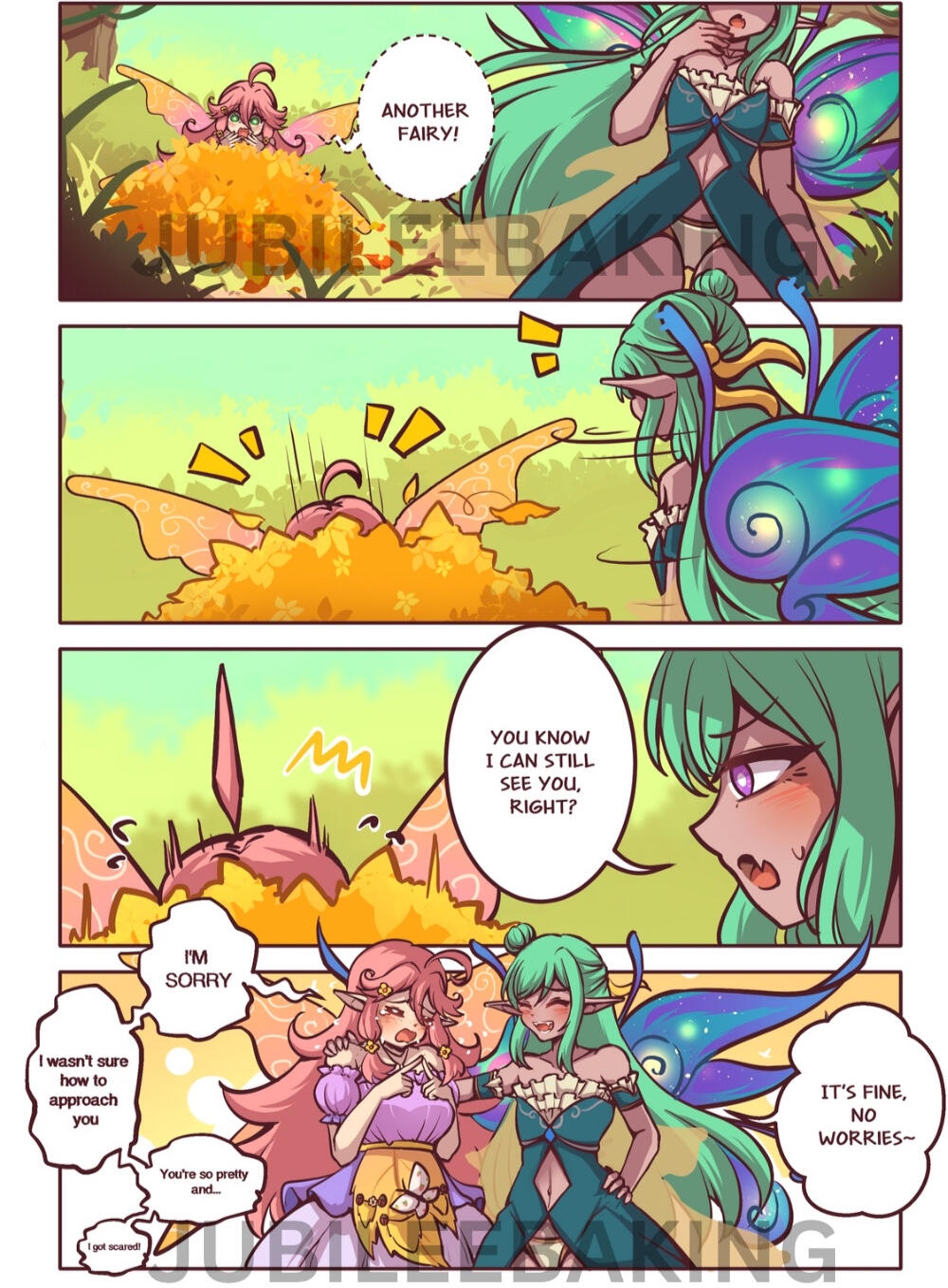 Long ago, in the fae realm a fairy princess was born to the summer court named Jubilee. Born from a peach tree blossom in the gardens of the seeile court, she was bright and full of life. Never wanting to sit still for long, she fluttered about the lands, always seeking a new adventure or to make new friends. Bringing with her baked goods she made within the palace, she hoped that these sweet treats would bring a smile to those around her. However, that happiness soon turned to tragedy.War broke out in the fae realm. Confined to the palace, Jubilee grew more and more anxious for her friends. Days turned to months and Jubilee, unable to sit still any longer, decided to set out, determined to make sure that her friends were safe. While trying to be discreet during her outing, she had failed to see those who lurked in the shadows. It is unknown exactly what transpired but one thing was certain. Jubilee’s light had been extinguished.Despite her light being snuffed out, Jubilee, like most fairies, would simply be reborn. No prior knowledge of their past selves would exist but they were never truly gone. That is how Jubilee came to be the very fairy you know today.“I wish for a friend.”This wish was made by a pure hearted child upon a peach seed. Planting the seed, it grew overnight into a magical peach tree. The stunned child plucked the only peach on the tree and, in a blinding light, the peach disappeared and instead what was in their hands was a small fairy.“Hello, nice to meet you!”She smiled at them. Despite having no knowledge of her previous life, what she was remained at the forefront of her mind along with a name.“My name’s Jubilee, are you the one who made a wish for a friend?”The child gave a hesitant nod but that sealed the start of their lifelong friendship. The two of them would go on adventures, bake sweet treats together, and do basically anything and everything together. As the years began to flow by, their friend eventually found others to rely on and even started a family of their own. Time can be cruel and while Jubilee hadn’t aged a day, her friend was now much older. She still spent what time she could with them, baking treats for them to brighten their days, but eventually, those times came to a close and Jubilee was left alone.Shortly after their passing, Jubilee attempted to make friends with some of the villagers. This action led her to quickly discover that most humans didn’t trust fairies or if they did, they wanted to use her for malicious purposes. So, for the next hundred years she kept to her peach tree, passing the days by smelling flowers or baking treats for the birds and bugs. That was, until she spotted another fairy for the first time.They had flown into the nearby forest and Jubilee, excited, followed them to the riverbank. It was here that Jubilee met Sylla and the two quickly became friends. Sylla, after hearing Jubilee’s story, escorted her to the fae realm where Jubilee met with the king and queen of the Seelie Court. Granted the right to stay in the realm she was given the stipulation that she must make her home away from other fae. The reason for this is because she was born in the human realm, the barrier between the two would be more unstable and to prevent issue, she should be away from others.While the news did upset her, she fully agreed and understood what she had to give up to live here. So, with the help of some powerful magic her peach tree vanished from the human realm and instead resided in a peach grove in the fae realm, far from others. This didn't stop the fairy from making friends though and eventually, even opening a cafe within her peach tree for others to rest, relax, and enjoy a sweet treat.